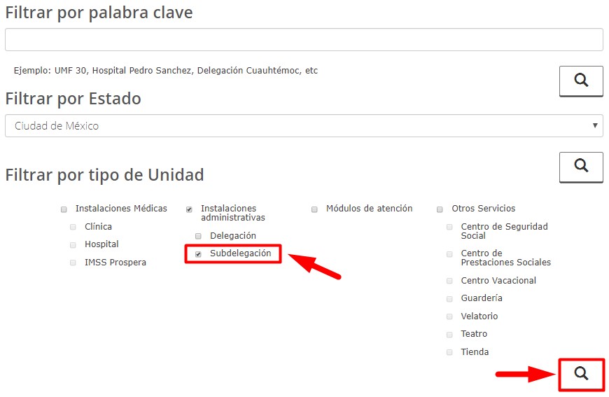 - Luego, en la sección de “Filtrar por unidad” haz clic en “Instalaciones administrativas” y posteriormente en “subdelegación”.